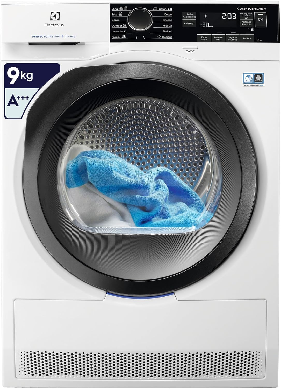 Dal punto di vista delle tecnologie, la PerfectCare 900 integra diverse soluzioni pensate per rispettare i tessuti. La funzione DelicateCare regola temperatura e movimento del cestello in base al tipo di tessuto, così da preservare la forma e le proprietà dei capi più sensibili come lana, seta o indumenti tecnici. Accanto a questa, 3DSense è un sistema di sensori che rileva l’umidità in più punti del carico e assicura un’asciugatura uniforme anche su capi molto voluminosi o su imbottiti, contribuendo a ripristinare la morbidezza dei materiali al termine del ciclo. Per chi cerca un equilibrio tra tempo e risparmio energetico esiste la modalità SmartSave, che permette di ridurre fino a 50 minuti di tempo su alcuni programmi o di risparmiare fino al 20% di energia per carico, adattando automaticamente il ciclo alle esigenze reali del carico.